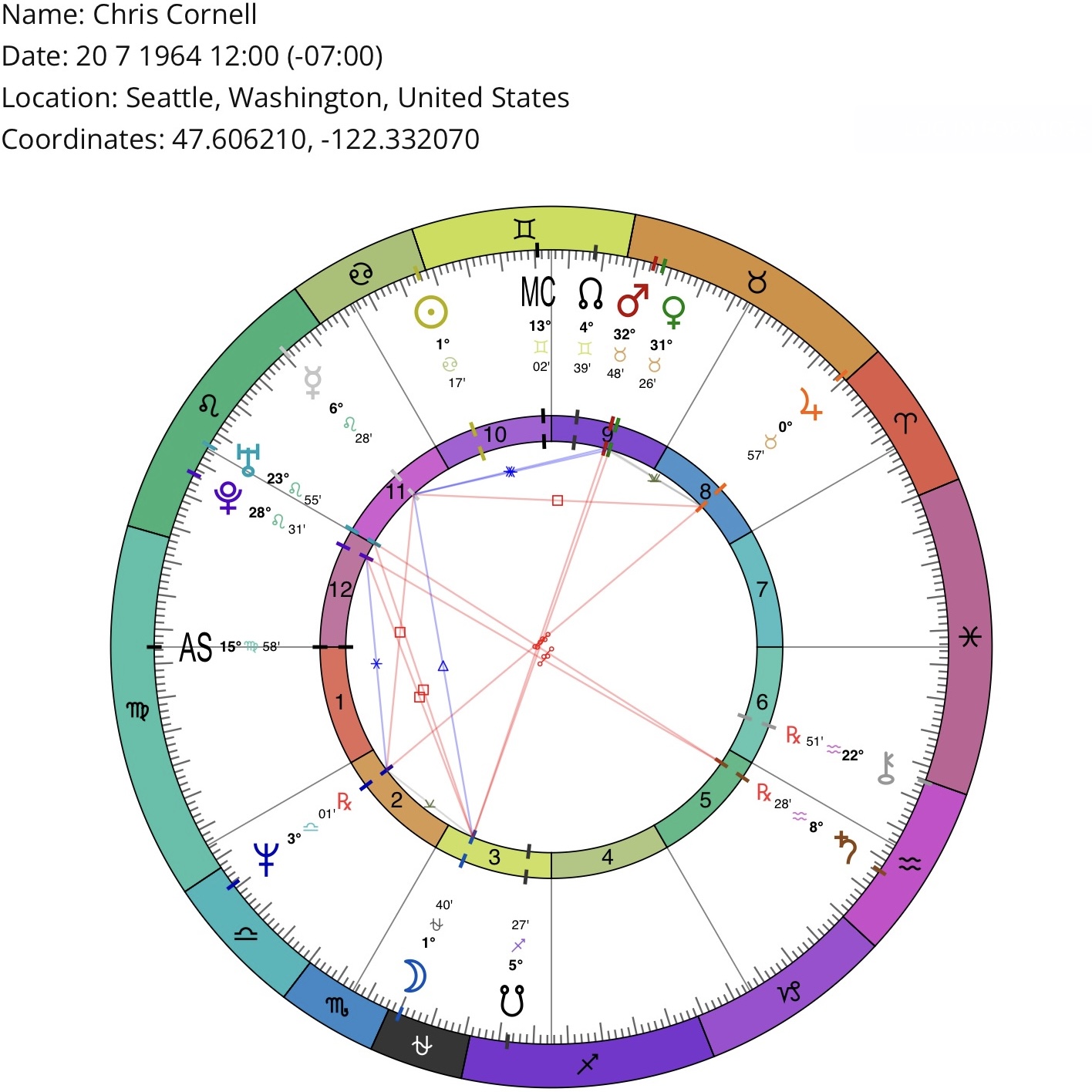 *Birth location/time may be inaccurate (but sufficient for astrological purposes). Courtesy of masteringthezodiac.com